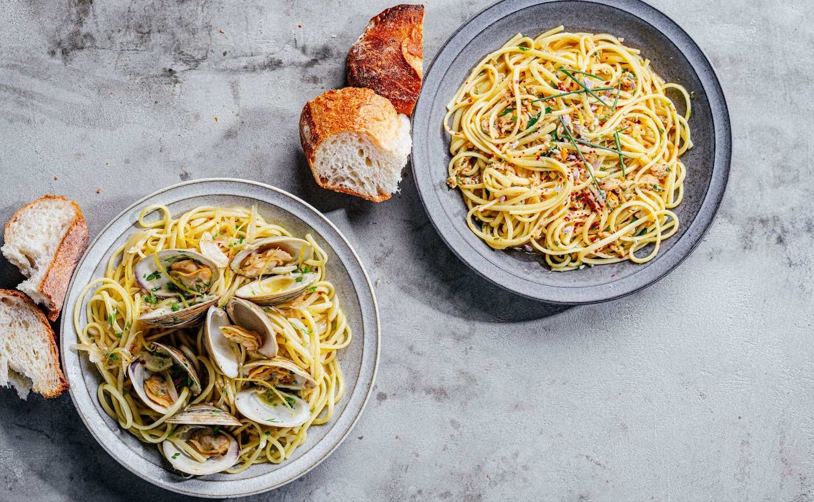 - Divide the pasta into bowls and top with the reserved clams, the sauce left in the pan, and a drizzle of fresh oil. Serve immediately with crusty bread.