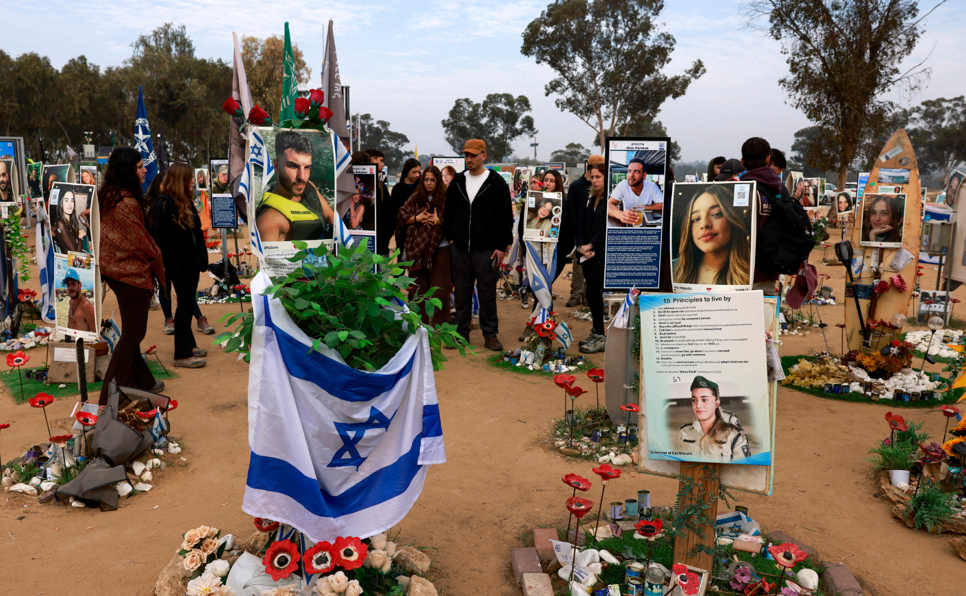 At the site of the Nova music festival in Re’im, visitors take in an installation honoring victims of the Oct. 7 attacks. (Getty Images)