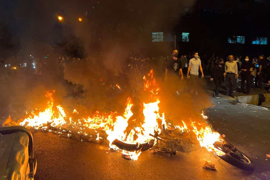 A picture obtained by AFP outside Iran shows demonstrators gathering near a motorbike on fire during a protest for Mahsa Amini, a woman who died after being arrested by the Islamic republic's "morality police," in Tehran on September 19, 2022. (Photo by -/AFP via Getty Images)