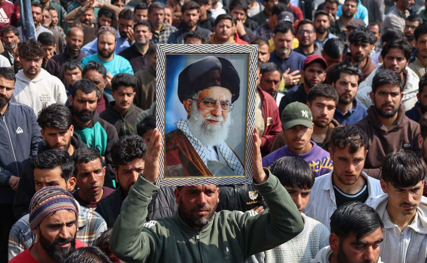 A Shiite Muslim man holds a portrait of Iran’s Supreme Leader, Ayatollah Ali Khamenei, during a protest condemning his killing. (Getty Images)